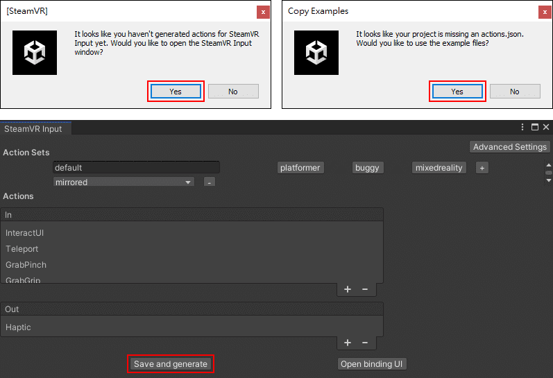 點擊Play出現以下兩視窗都點選Yes,隨後又出現SteamVR Input就點選Save and generate,然後關掉視窗即可。(這些在同一專案中只需設定一次)