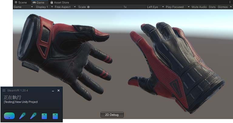 若VR硬體設置都正確,戴上頭盔即可環視場景,而畫面中的兩個手套代表左右手控制器。試著按手把上的各個按鈕,畫面中的手指也會跟著一起動。