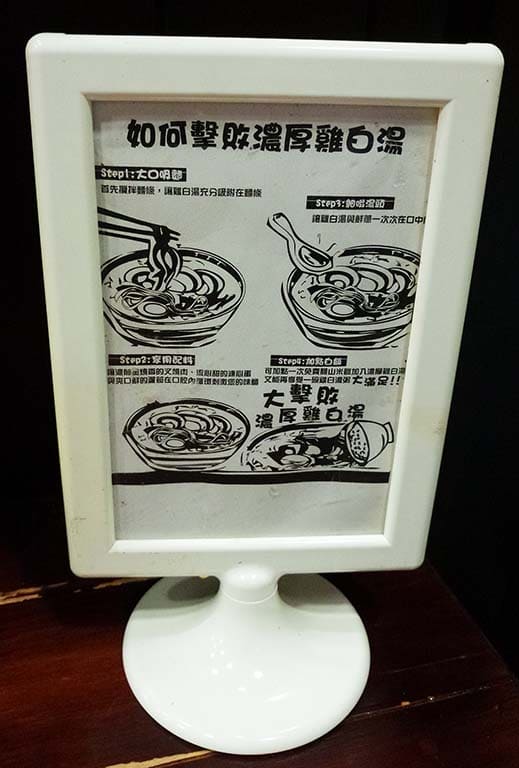 點完餐後等待老闆現煮同時,順便看了一下桌上的擊敗雞白湯拉麵秘訣,不知道為甚麼一直覺得提到擊敗和雞白湯感覺好像甚麼諧音怪怪的,哈哈,可能是我想太多了。店內的吧檯桌上都有放一壺壺的冰水可以自己裝來喝,牆上也有掛著吃拉麵的照片,越看越期待濃厚雞白湯拉麵上桌。