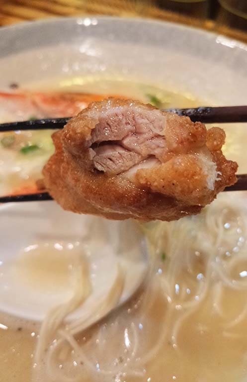 小郜家拉麵的後勁真強,吃完回去後讓人朝思暮想,過沒幾天立馬又再訪,這次學聰明,挑了下午剛營業時段過來,果然不用排隊裡面就有位子可以坐,而且菜單上的菜通通都還有供應。點了大家推薦的炸雞(唐揚雞)還有名字最長的拉麵——海老干貝雞白湯拉麵。拉麵湯頭感覺比上次吃的鹽味更加濃,多了海鮮的味道,乳白色的湯頭看起來好像鮮奶,濃純香,兩隻白蝦肉質鮮美而且也很大隻。
