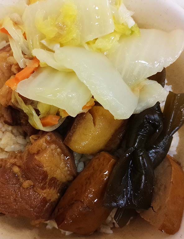 我們點了一份香煎豬排飯、控肉飯、綜合大餛飩湯,控肉飯和香煎豬排飯的配菜是一樣的,香煎豬排飯有多了一個荷包蛋。白菜煮得很軟,很像辦桌會吃到的白菜滷味道,配飯很適合,豆干滷的有點鹹,但是配飯剛剛好,海帶保有硬度不會軟爛。
