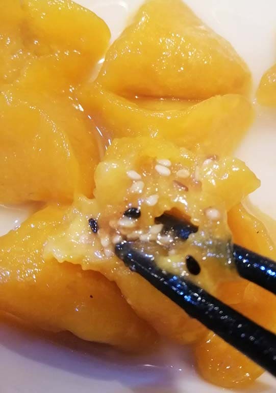 最後一道也是我最期待的黃金餃,金黃色的外皮超像芒果,用地瓜做成的皮口感超Q彈,就是在吃芋圓地瓜圓的感覺,內餡包的是黑芝麻和白芝麻,吃起來甜甜的。