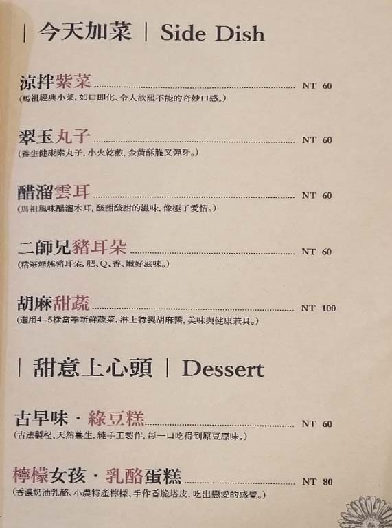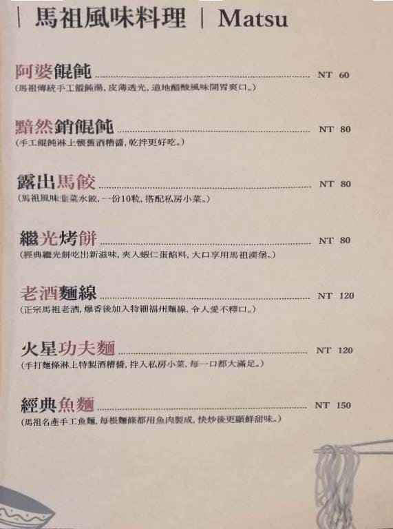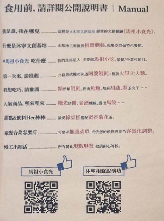 馬祖小食光菜單前面的請詳閱公開說明書的設計超有創意,有來沐寧文創基地的朋友一定要來吃看看。