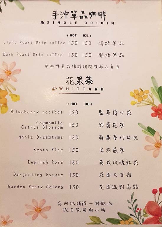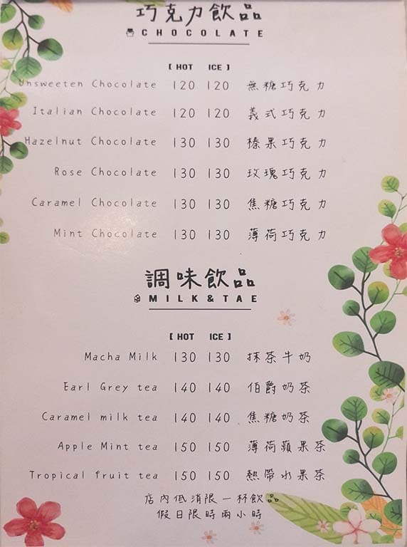 店內除了假日有限兩小時之外,平日只要低消一杯飲品就不限用餐時間,人少的時候可以好好享受下午茶時光。甜點依現場為主,有時候會有菜單上沒有的甜點,有時候則是太快就售完了,所以要吃甚麼就到玻璃櫥窗前挑選。很少來下午差咖啡廳吃甜點蛋糕,每項都好精緻不知道該選甚麼才好,看到了一個茶里布朗的手工甜點瞬間想到史奴比裡的那個查理布朗,於是就選擇他了,再來朋友點了一個沒有放上名字的甜點(後來有看到其他人去吃才知道他的名字是CHIC)。