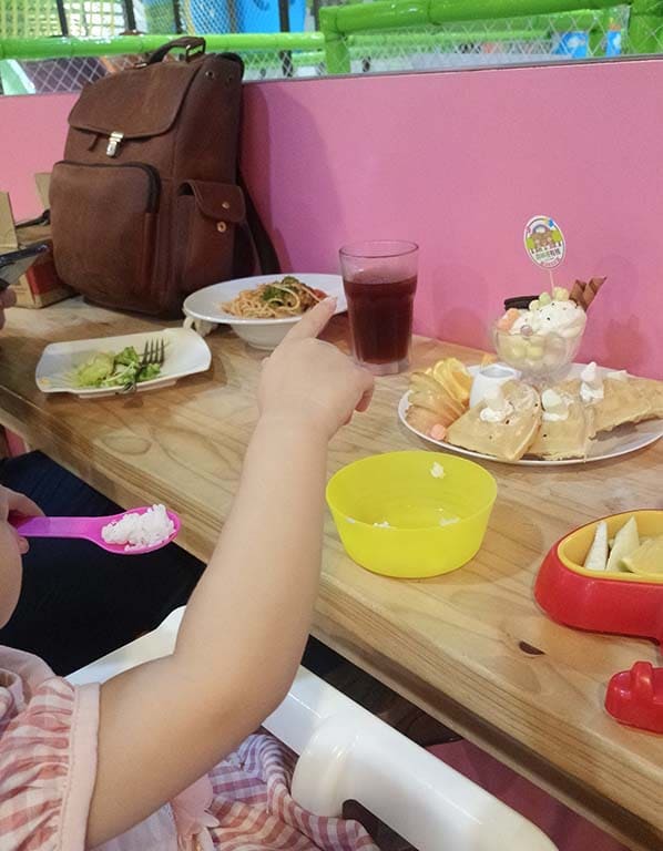 小孩放電的好選擇,玩到累了自己說肚子餓就出來點餐,點了寶貝飛機餐、棉花糖鬆餅,同學點了茄汁義大利麵,原本想好好拍個食物照片,結果餐點一上桌,小孩看到超激動,直接用手抓了飛機餐食物開吃,那個熊熊果汁的外型好可愛,可是不能把空罐子帶走喔~唯一拍到完整的食物就是棉花糖鬆餅了,鬆餅口感是Q彈的那種,點了巧克力的所以中間有附一杯巧克力醬,冰淇淋和水果都很讚,柳丁超甜蘋果很脆很香,讓我很驚豔的是寶貝餐的咖哩超級好吃,原本預期親子餐廳的餐點應該都算普普,結果這個咖哩真的好優,好後悔這次沒點個主餐咖哩飯來吃,下次一定會來試試其他餐點。