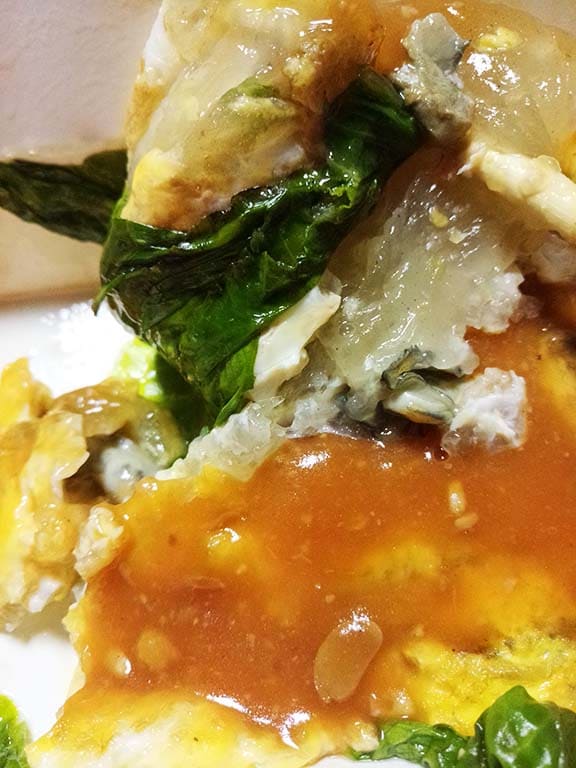 這次也是家裡的阿嬤指名說要吃這間蚵仔煎,買了蚵仔煎後還點了一份大碗的肉羹焿飯,怕家裡還有人要吃。這間的蚵仔煎醬料是我喜歡的那種,有點橘褐色帶豆瓣醬甜甜又鹹鹹的滋味,相較於夜市常見那種粉紅色醬料個人更中意這種。蚵仔煎個人覺得要現場煎出來馬上吃會更好吃,外帶回來有點涼掉了,麵糊變軟軟的,整個蚵仔煎算是大份,蚵仔雖然小小顆的但數量不少。