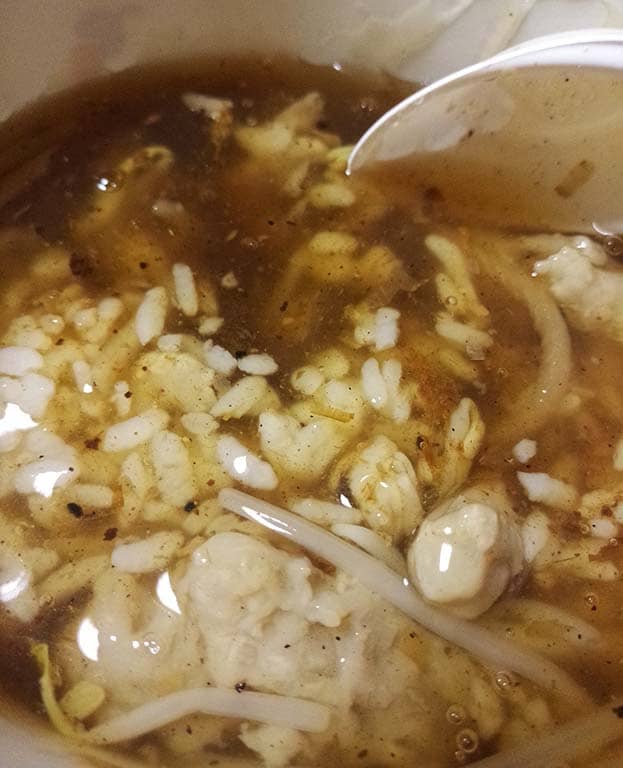 大碗的肉羹飯分量真的嚇到我了,比我想像中的還要多,連給的紙碗都裝不下,只好再拿一個碗來裝,肉羹新鮮吃的到肉的纖維,不像加了很多粉的肉羹,湯頭鮮美可口,不算太濃稠也不算稀,口感剛好介於中間,整個飯在肉羹湯裡攪拌均勻後,一口吃下超對味。如果想要同時吃到不同種類的料,可以點三寶焿(魷魚、花枝、肉焿)或是招牌焿(魚酥、魷魚、花枝、肉焿),可以任意選擇要搭飯、麵、冬粉、米粉。