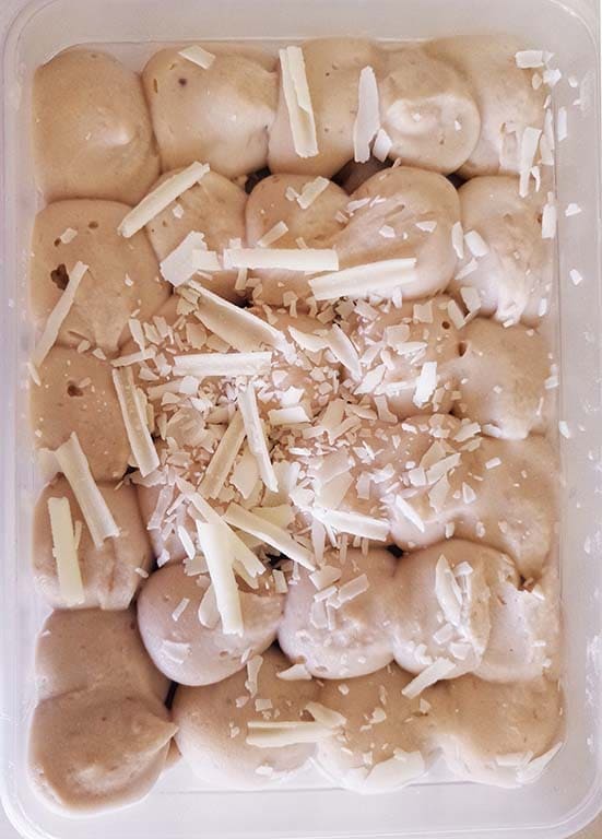 一包吐司會附上一盒冰奶餡,吐司跟內餡都是純生乳製作,奶香味濃厚。個人覺得冰奶餡分量很足夠,配完一包吐司後還剩三分之一盒(依個人使用量有所不同),剩下的內餡拿來沾其他食物也超搭,自己試過拿來配鹹鹹的餅乾意外好吃,甚至想當冰淇淋來吃也很讚。