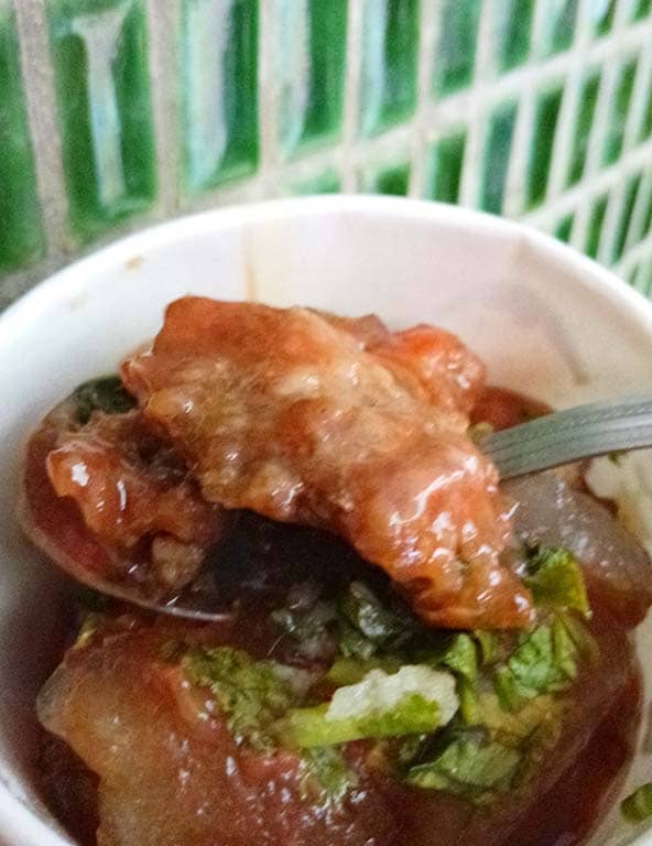 肉圓的皮半透明,超級Q彈有嚼勁,彈牙口感吃起來真的超讚,粉紅色的醬汁偏甜是個人的最愛,敢吃辣的可以加店家自己做的辣椒醬,家人和朋友吃過都說很厲害。內餡的豬肉很香,還有包爽脆口感的竹筍片,配著上頭的香菜和蒜泥甜醬汁一起吃,兒時的回憶都浮現眼前了。